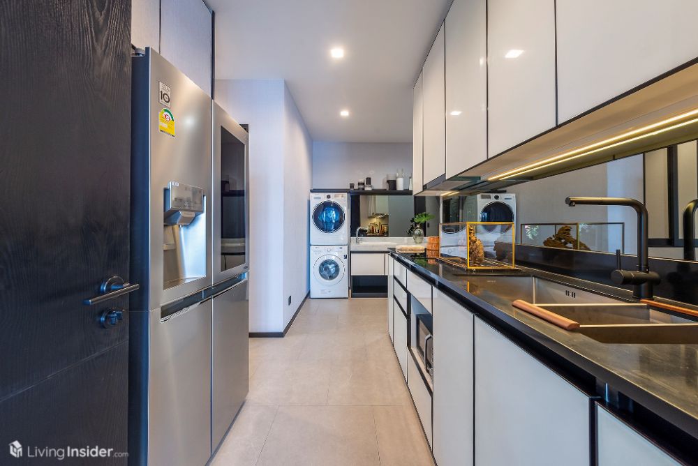 เปิดเข้ามาพบกับ Pantry ครัวซ้ายมือ บิวท์อินตามห้องตัวอย่างเลย Top หินสังเคราะห์ มีตู้เก็บของด้านบน หน้าบาน Gloss ผิวเงา เว้นพื้นที่วางตู้เย็น 2 ประตู, เครื่องซักผ้าฝาหน้า, ไมโครเวฟลงตัวพอดีๆ ชุดเตาไฟฟ้า - เครื่องดูดควัน, ซิงค์ล้างจาน เป็นของ Hafele ครับ