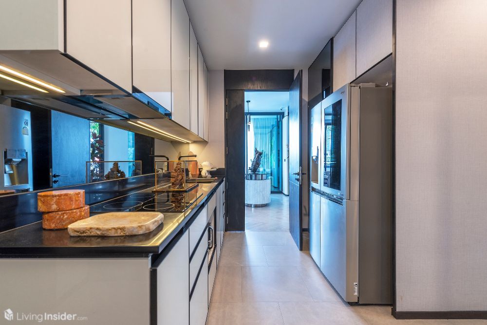 ส่วนครัวแยกพื้นที่ต่างหากครับ บิวท์อิน Pantry เต็มพื้นที่ พร้อมเตาไฟฟ้า 4 หัว + เครื่องดูดควัน, ซิงค์ล้างจาน ตรงข้ามวางตู้เย็นไซส์ XL ขนาดครอบครัวใหญ่ได้