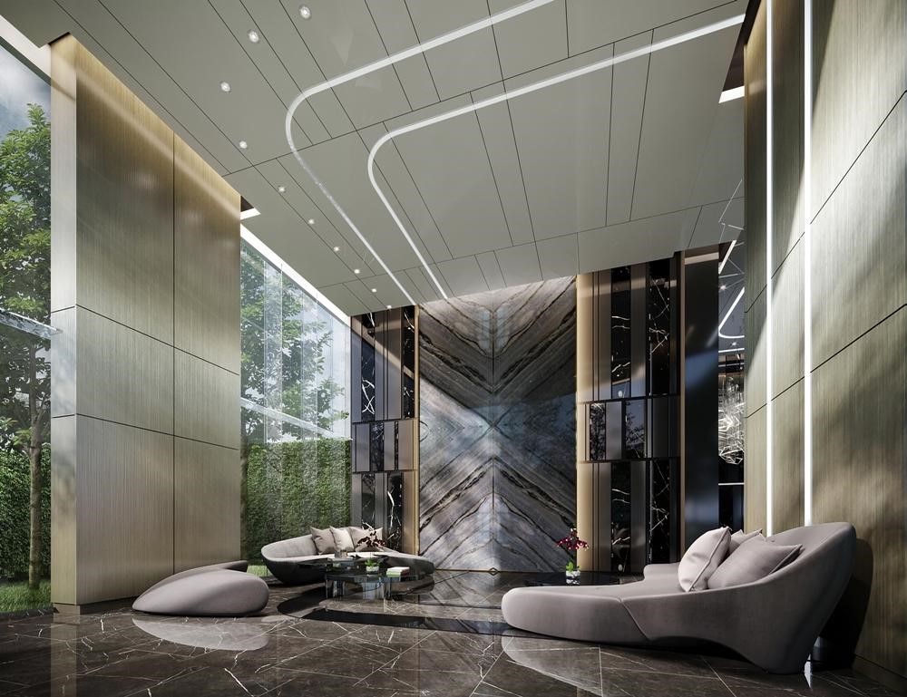 Main Lobby ตกแต่งสไตล์ Modern Luxury กรุเสาด้วยหินอ่อน (Black Maquina) ปูพื้นด้วยหิน Pietra Grey ด้านในเป็น Lobby Lounge สำหรับพักผ่อน กรุผนัง Blue Danube (Bookmatch) และ Waiting Area ด้านนอกครับ ลิฟต์โดยสาร 3+1 ตัว เทียบจำนวนยูนิตถือว่าสบายๆครับ