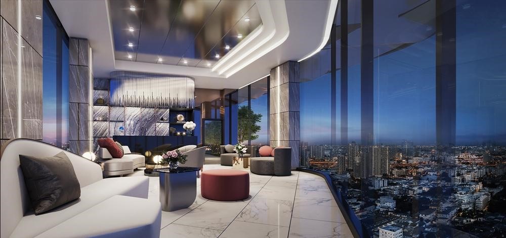 Sky Lounge กรุผนัง Pietra Grey พร้อมปูพื้นหินอ่อน White Volakas หรูหราเอาเรื่อง อ่านหนังสือ นั่งเล่น ชมวิวเมือง