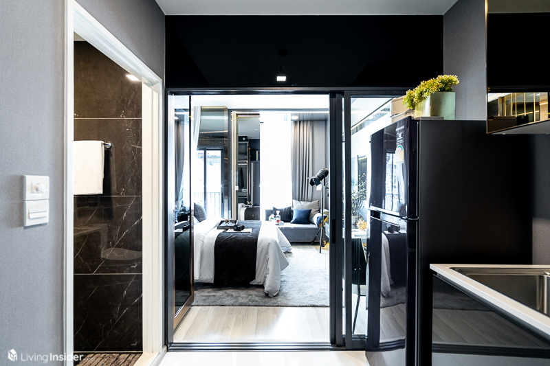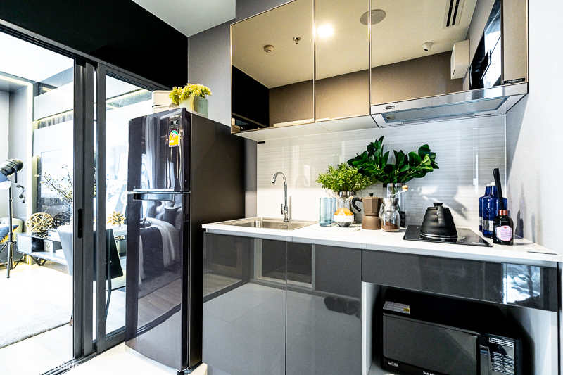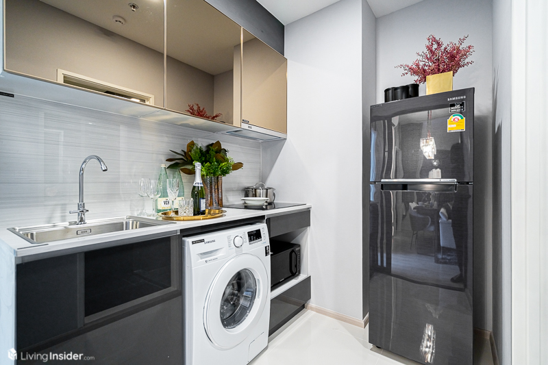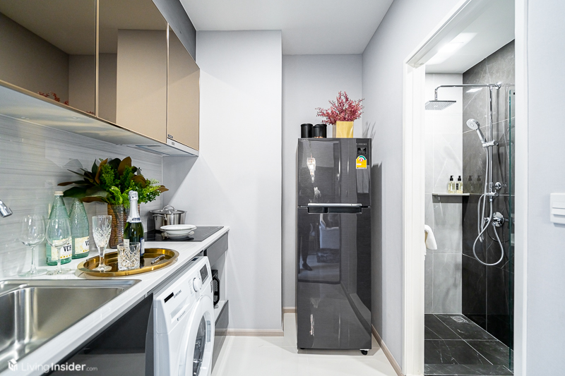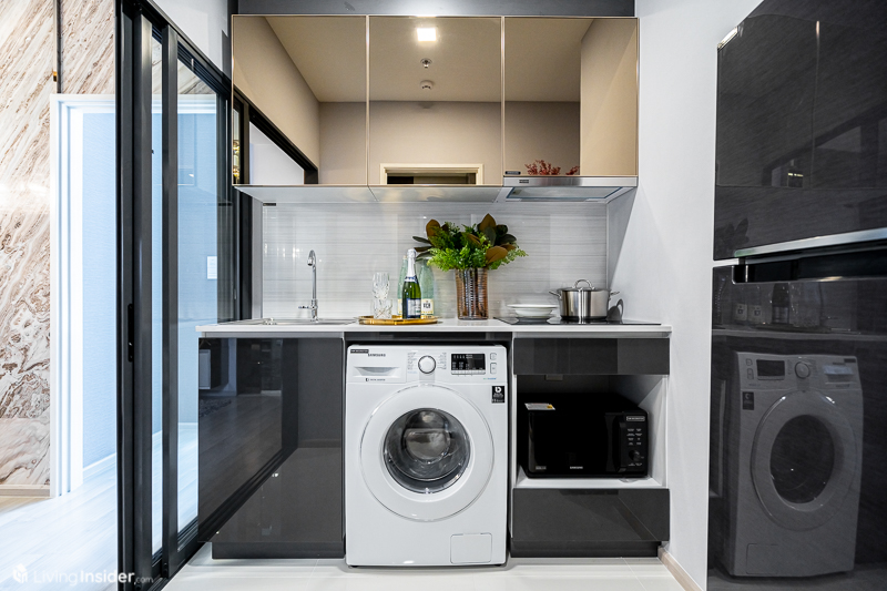 พื้นที่ครัวขนาดกะทัดรัด มีประตูบานเลื่อนแยกสัดส่วน บิวท์อิน Pantry เหมือนยูนิต Studio เพิ่มจุดติดตั้งเครื่องซักผ้าเว้นพื้นที่วางตู้เย็น-ไมโครเวฟลงตัวพอดี