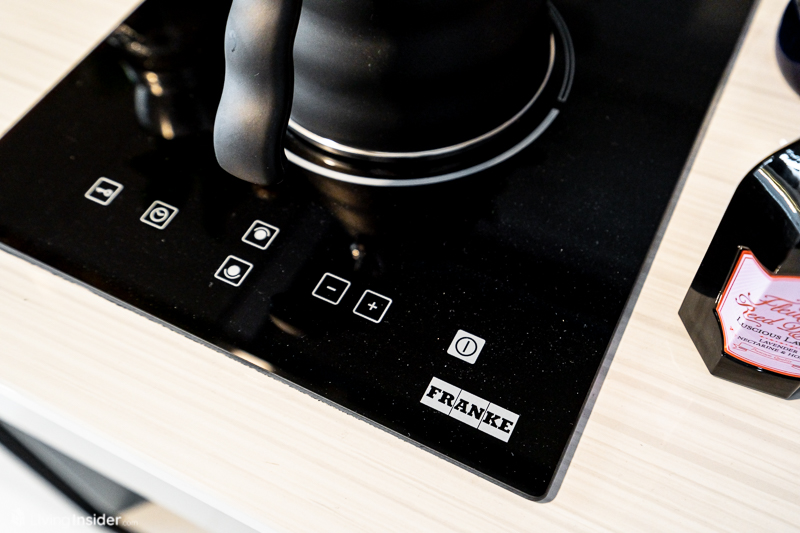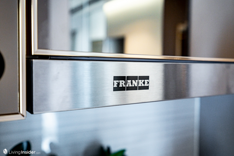 พร้อมเตาไฟฟ้า เครื่องดูดควันแบรนด์ Franke เว้นพื้นที่วางตู้เย็น 2 ประตู ไมโครเวฟอย่างพอดีๆ