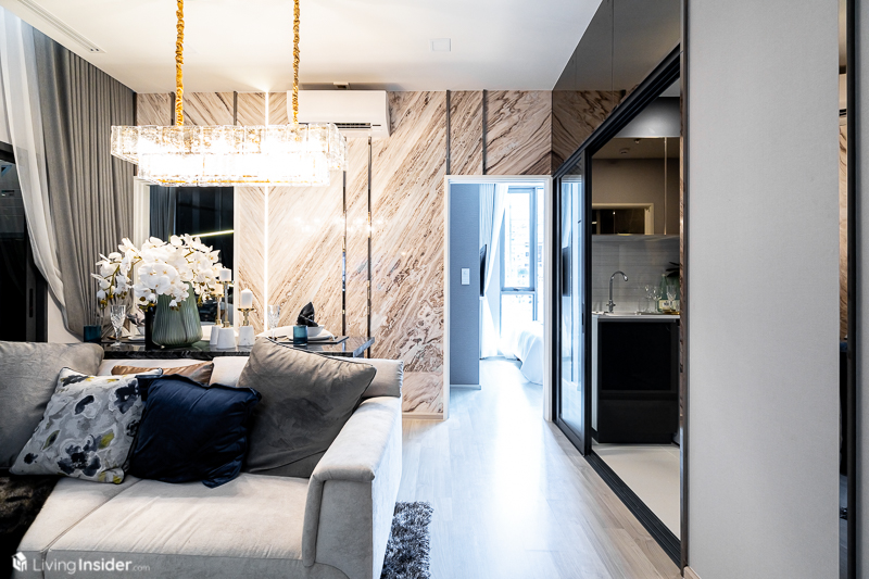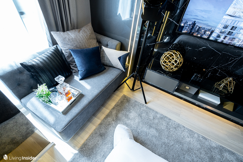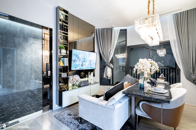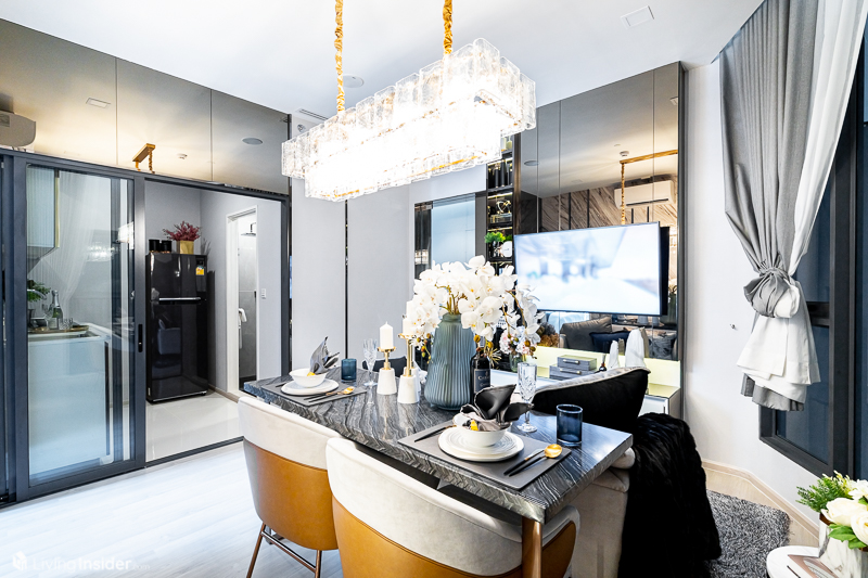 เปิดเข้ามาพบกับ Common Area โถงกลาง ด้านขวามือเป็นครัวและห้องน้ำส่วนกลาง ส่วนนั่งเล่นจัดโซฟา 2 ที่นั่ง โต๊ะทานอาหาร ชั้นวางทีวีได้อย่างลงตัว แต่การจัดวางสามารถปรับเปลี่ยนตาม Lifestyle แต่ละคน