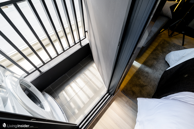 ด้านนอกมีระเบียงขนาดกระทัดรัดพอวางเครื่องซักผ้าฝาหน้าได้ หากต้องการตากผ้าต้องหาราวแขวนลอยติดตั้งเพิ่มได้ครับ