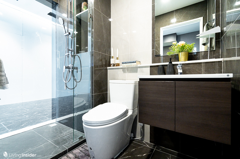 ห้องน้ำสเปคดีทีเดียวอ่างล้างหน้า (Lavenz) พร้อมตู้เก็บของใต้อ่าง สุขภัณฑ์ถือว่าให้แบบคอนโดระดับ Luxury กันเลย Washlet (Cotto), Rain Shower พร้อมฉากกั้นกระจกและช่องวางของใช้ส่วนตัว