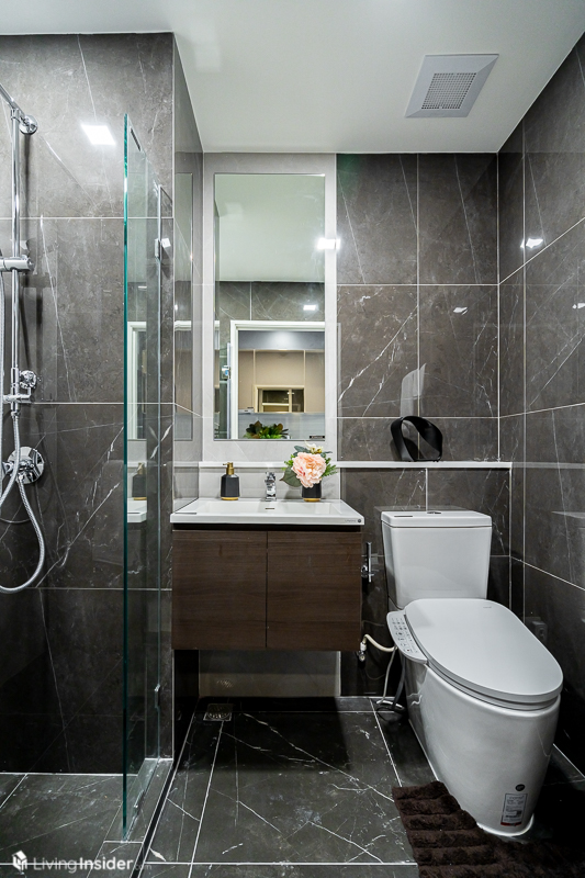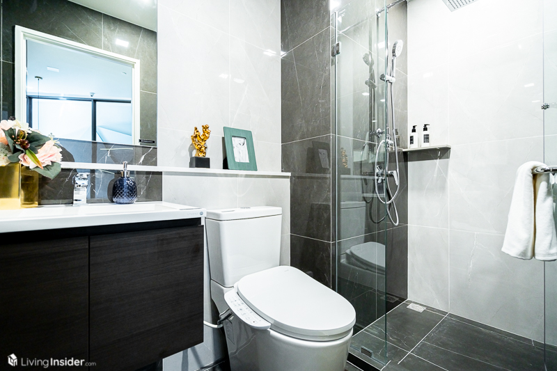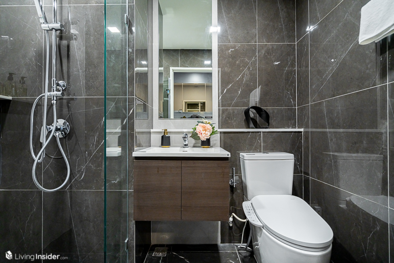ห้องน้ำส่วนกลาง ให้สุขภัณฑ์จัดเต็มเช่นเดิมมีทั้ง Washlet, อ่างล้างหน้า + ตู้เก็บของใต้อ่าง พร้อมฉากกั้นอาบน้ำกระจกนิรภัยแบ่งโซนอย่างลงตัว