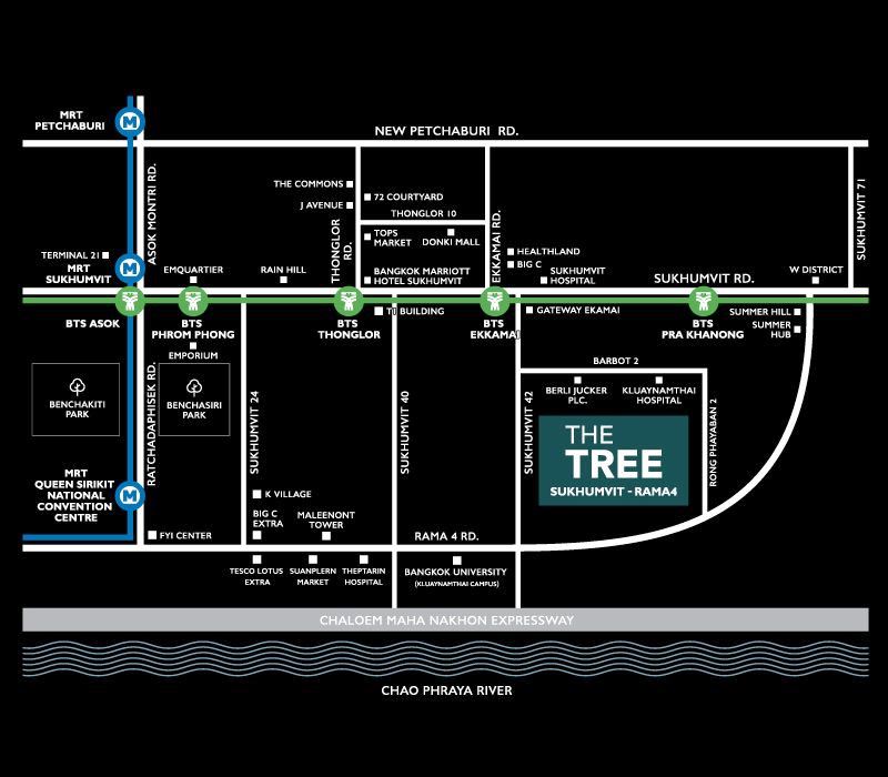 The Tree สุขุมวิท - พระราม 4 อยู่ติดถนนใหญ่เลยครับ บน ถ.พระราม 4 บริเวณใกล้แยก ‘กล้วยน้ำไท’ ตัวโครงการมีระยะห่างจาก BTS พระโขนง 540 เมตร หรือ BTS เอกมัย + Gateway เอกมัย ประมาณ 1 กม. ระยะพอเดินได้ ทั้งนี้มีวินมอเตอร์ไซค์รับส่ง รอบละ 20 บาท หรือเรียก Grab หารถไม่ยากเพราะติดถนนสายหลักครับ