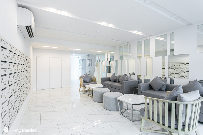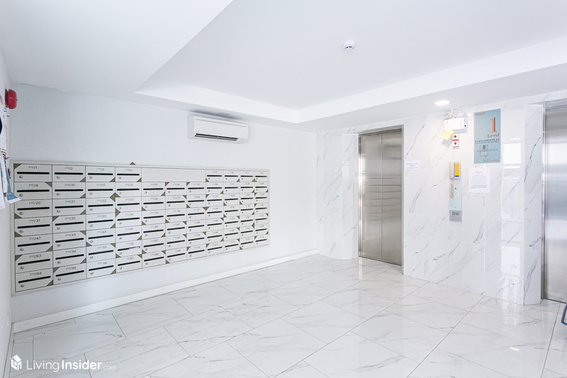 Main Lobby บริเวณอาคาร A ตกแต่งโทนสีเทาเรียบๆ เทควิวสระว่ายน้ำ - พื้นที่สวนด้านนอก พร้อม Mail Box และ Lift Hall (2 ตัว) เหลือเฟือกับจำนวนยูนิต (39:1) ส่วนอาคาร B มีเพียง Mail Box กับ Lift Hall เท่านั้น