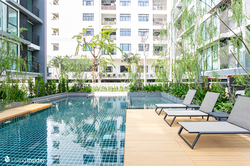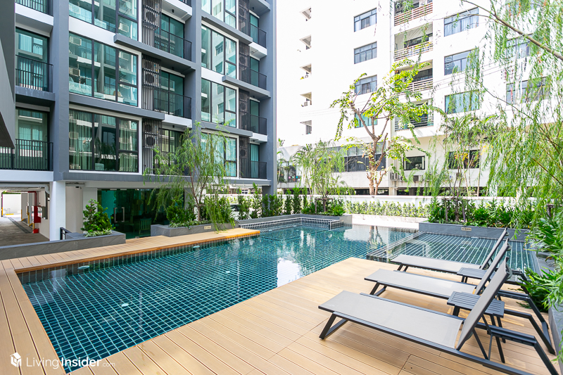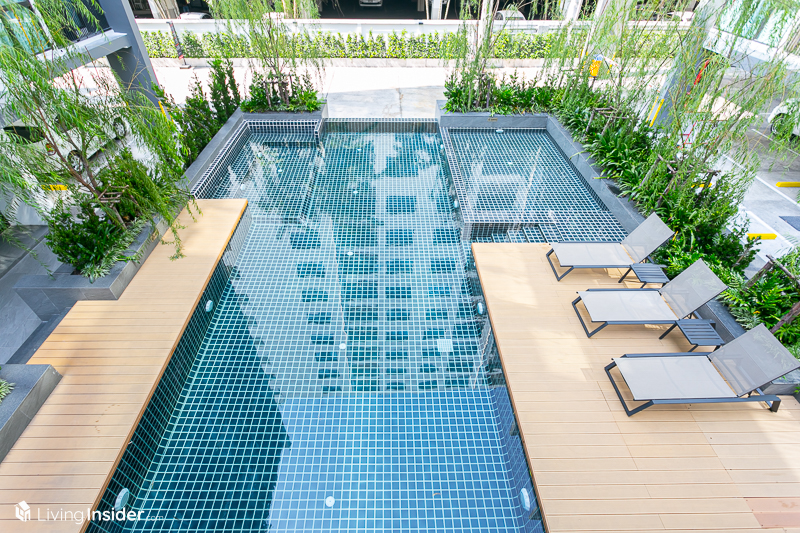 สระว่ายน้ำ (Swimming Pool) แบ่งเป็น Lap Pool - Kids Pool และ Pool Deck สำหรับพักผ่อน รอบด้านเป็นพื้นที่สีเขียวเพิ่มความร่มรื่น บรรยากาศค่อนข้างเงียบสงบครับ