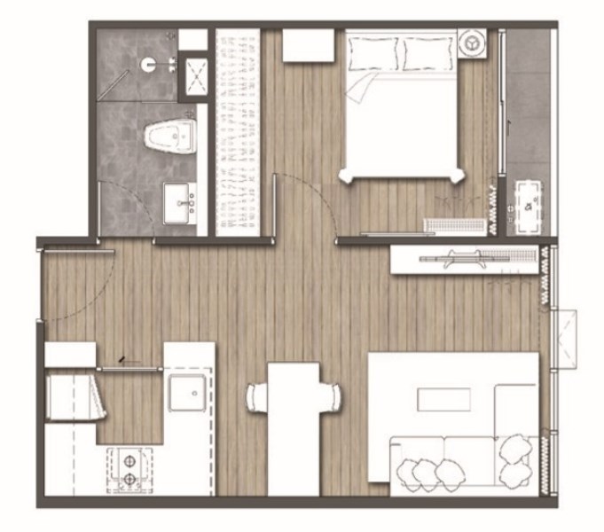 ห้องตัวอย่าง 1-Bedroom ไซส์ใหญ่ (41 ตร.ม.) เน้น Common Area กว้างขวางเป็นพิเศษ พร้อมห้องนอนแยกสัดส่วนต่างหาก ระเบียงกว้าง เหมาะกับอาศัย 1-2 คน ปรับเปลี่ยนฟังก์ชั่นได้พอสมควรครับ