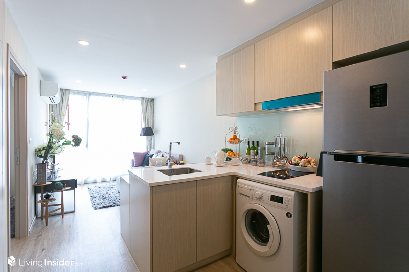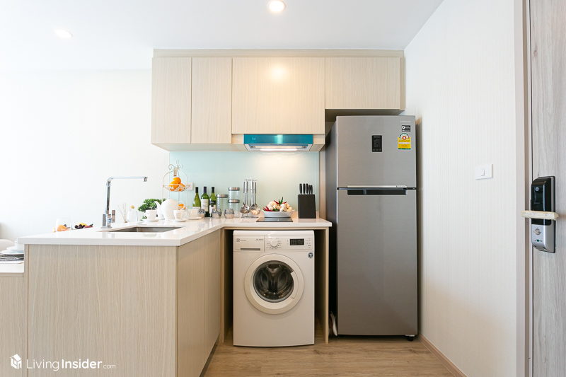เปิดเข้ามาพบกับพื้นที่ครัวขวามือเป็น แบบครัวเปิด บิวท์อิน Pantry ทรง L-Shape แบ่งเป็นจุดเตรียมทำอาหาร Top หินสังเคราะห์สีขาว ตู้เก็บของด้านบน - ล่าง หน้าบานลามิเนตลายไม้ เว้นช่องวางตู้เย็น 2 ประตู ส่วนเตาไฟฟ้า เครื่องดูดควัน อ่างล้างจานใช้ของ Teka ครับ จุดวางเครื่องซักผ้าจะอยู่ตรงนี้โดยใช้แบบฝาหน้า