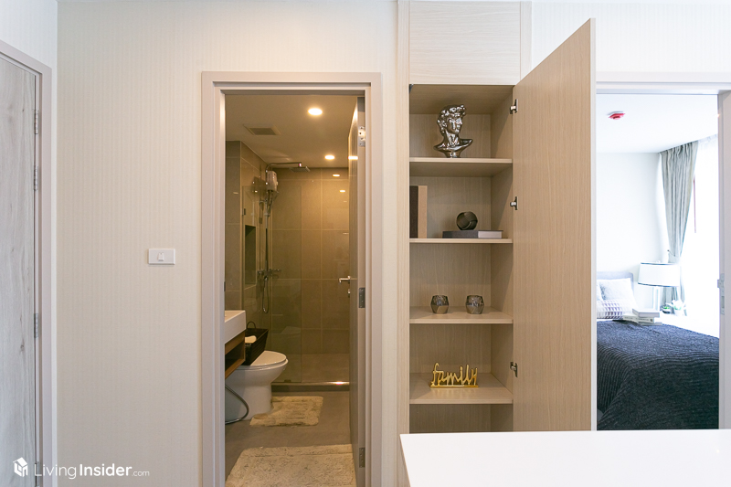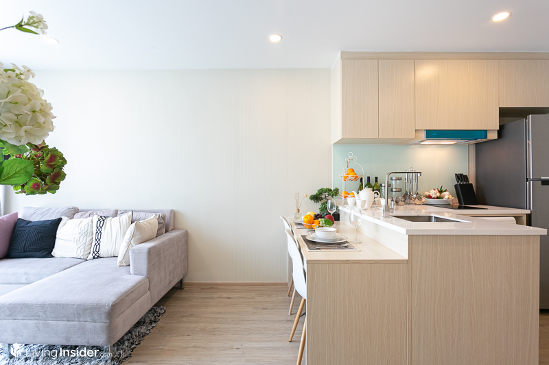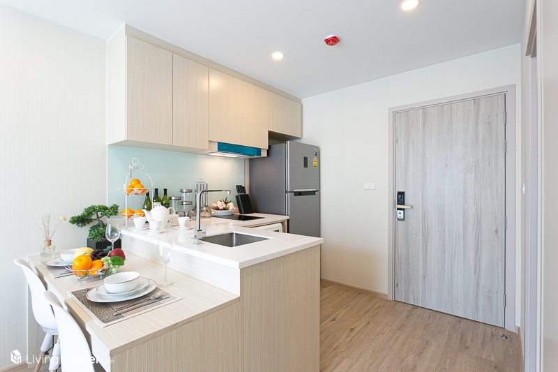 อีกด้านบิวท์อินเป็นเคาน์เตอร์สำหรับทานอาหาร 2 ที่นั่ง มีเก้าอี้ให้พร้อมเลย ซึ่งการบิวท์อินแบบนี้ทำให้มีพื้นที่เหลือเฟือในการเลื่อนถอยเก้าอี้เข้า-ออก