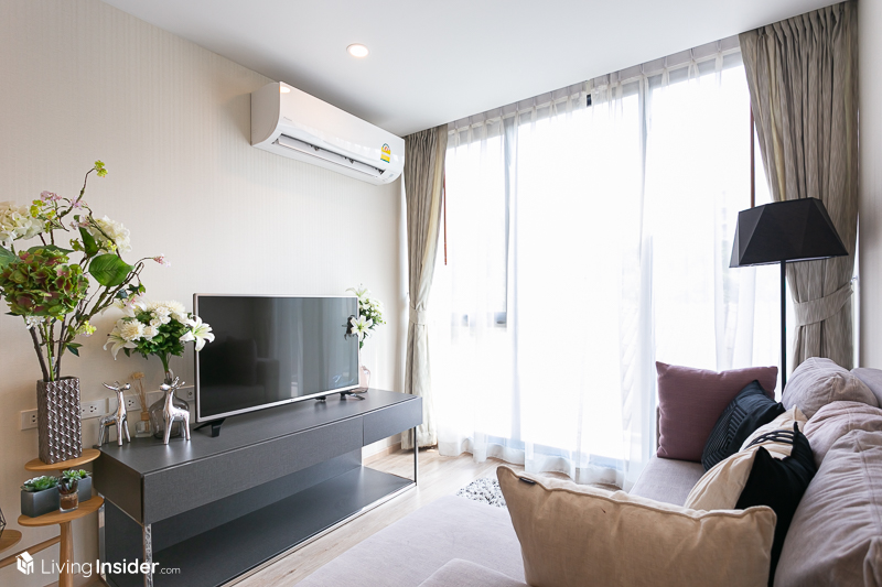 พื้นที่นั่งเล่น จัดโซฟาขนาด 3 ที่นั่ง ชั้นวางทีวีขนาดใหญ่ ระยะสายตาประมาณ 1.5 เมตร ส่วนตัวชอบหน้าต่างโครงการนี้ครับ บานเต็ม (Floor to Ceiling) รับแสงสว่างเต็มที่ ทำให้ห้องดูโปร่งมากขึ้น
