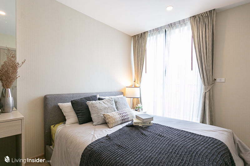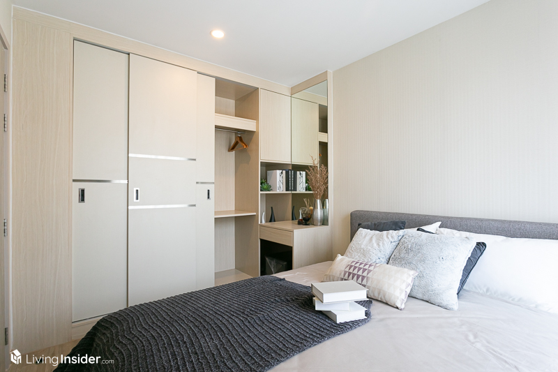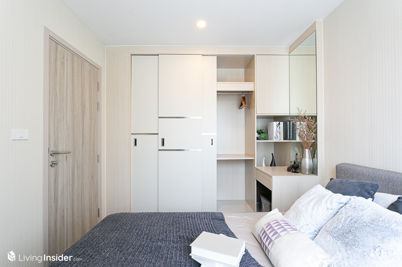 ห้องนอน กั้นสัดส่วนแยกเพิ่มความเป็นส่วนตัว มาพร้อมเตียง 5 ฟุต ตู้เสื้อผ้าบิวท์อินผนัง + โต๊ะแต่งตัว และตู้ข้างเตียง สามารถแขวนทีวีผนังเพิ่มได้