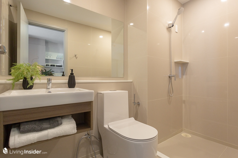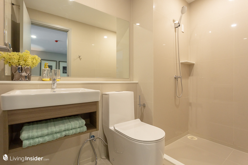 ตัวห้องน้ำ อยู่ฝั่งชั้นวางทีวี ได้สุขภัณฑ์ครบ อ่างล้างหน้าและก๊อกน้ำแบรนด์ Cotto โถสุขภัณฑ์ แบรนด์ Cristina แยกโซนอาบน้ำให้พร้อมใช้งาน ติดผ้าม่านหรือกระจกกั้นแยกส่วนเปียกอีกนิดก็โอเคแล้ว