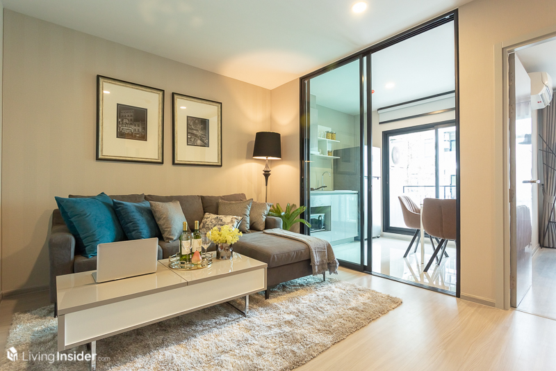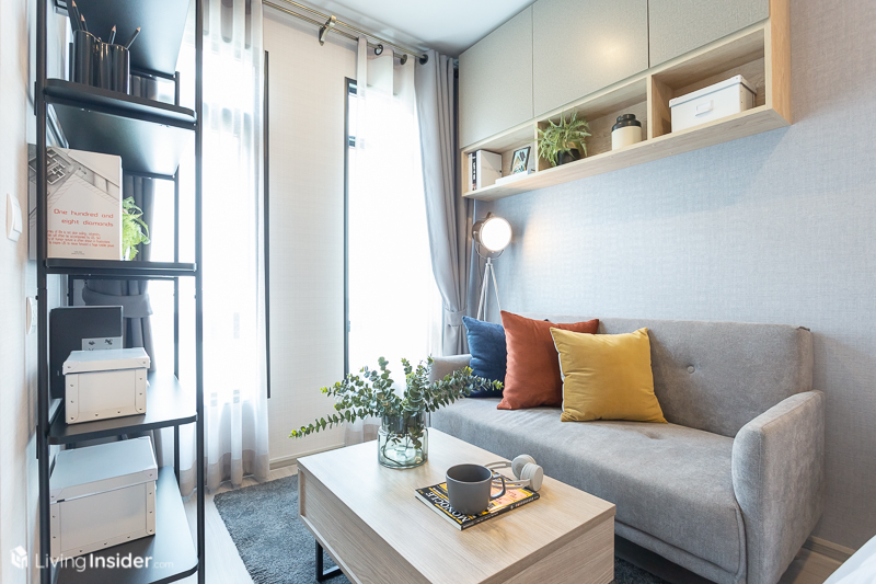 เพื่อให้มีพื้นที่วางได้ทั้งโซฟาขนาด 1-2 ที่นั่ง โต๊ะกลาง และเพิ่มโต๊ะทำงานพร้อมตู้เก็บของเข้าไปอีกได้ หรือจะบิวท์อินเป็นชั้นเก็บของด้านบนแบบในห้องตัวอย่าง ก็เป็นไอเดียที่น่าสนใจไม่เบา โดยมุมนี้จะได้กระจกสองบานช่วยให้ลมธรรมชาติและช่องแสงเข้ามาได้มากขึ้น ส่งผลให้ห้องดูโปร่งและดูกว้างกว่าเดิม