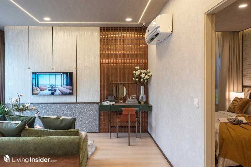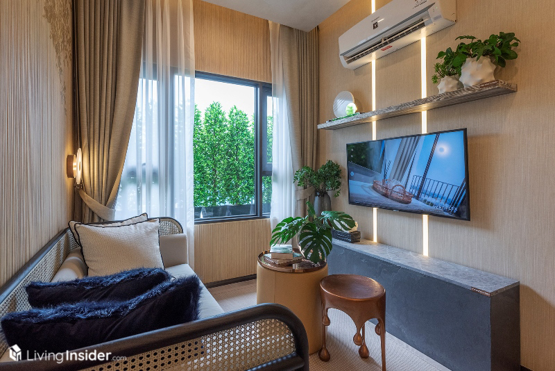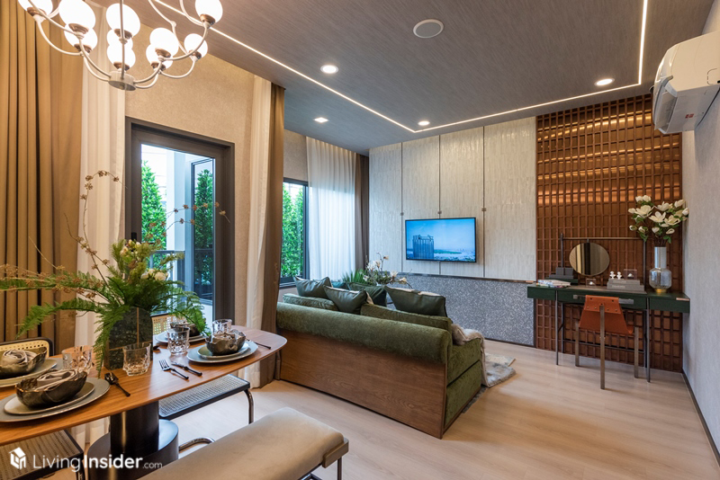 รวมถึง ห้องนั่งเล่น ที่อยู่บริเวณเดียวกัน โดยจะวางโซฟาตามห้องตัวอย่างหรือเปลี่ยนเป็นโซฟาแบบตัวแอลก็ทำได้ ฝั่งตรงข้ามสามารถติดทีวีขนาด 50 นิ้ว ได้เลย เพราะมีระยะห่างในการดูพอสมควร ติดกันเป็นมุมสำหรับนั่งทำงาน
