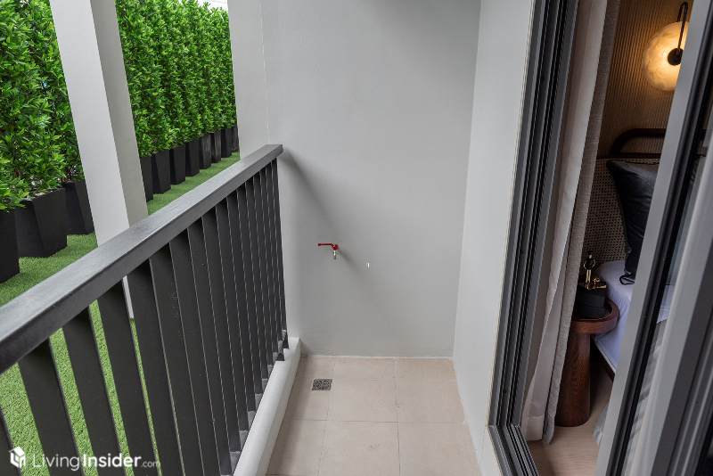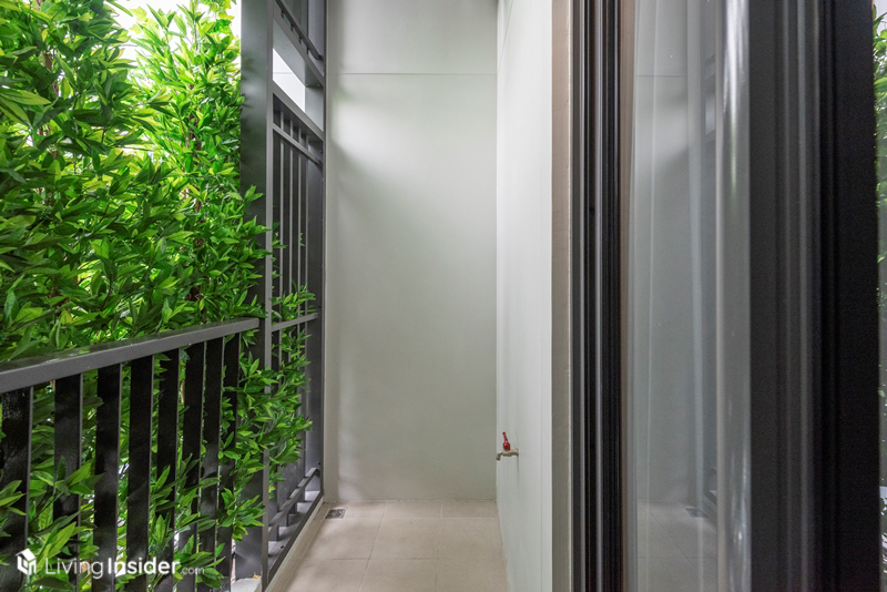 ติดกันกับฝั่งวางทีวีมีประตูเชื่อมออกไปสู่ระเบียงด้านนอก สามารถปลูกต้นไม้ทำเป็นสวนเล็กๆ หรือจะวางเก้าอี้นั่งชมวิวด้านนอกก็ได้เหมือนกัน