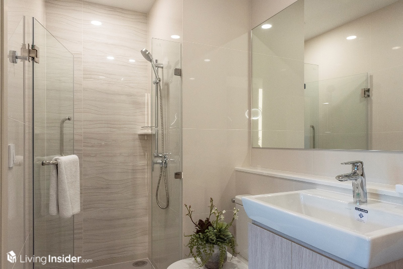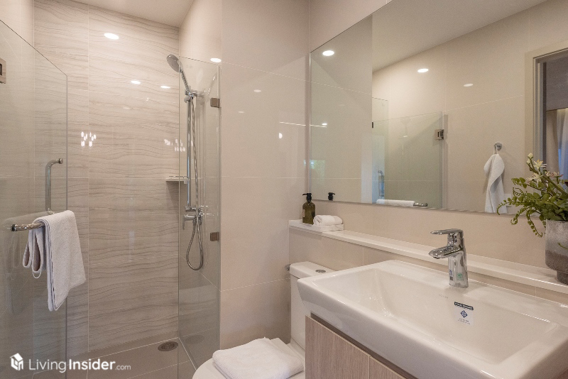 แต่ก่อนจะขึ้นชั้นบนขอพาไปดู ห้องน้ำ โดยเป็นห้องน้ำสำเร็จรูป ที่ทำออกมาได้ดีเลย ครบครันทั้งอ่างล้างหน้า พร้อมที่วางของด้านหลัง ได้โถสุขภัณฑ์ พื้นที่อาบน้ำ และติดกระจกฉากกั้นมาให้เรียบร้อย ซึ่งห้อง Vertiplex เราจะได้ห้องเก็บของใต้บันไดที่อยู่ติดกับห้องน้ำด้วย
