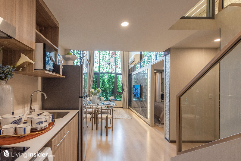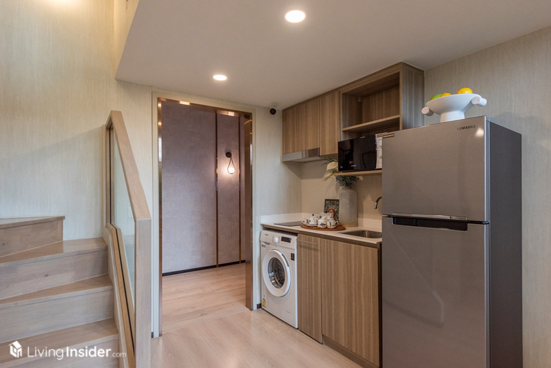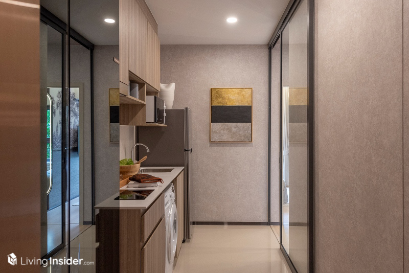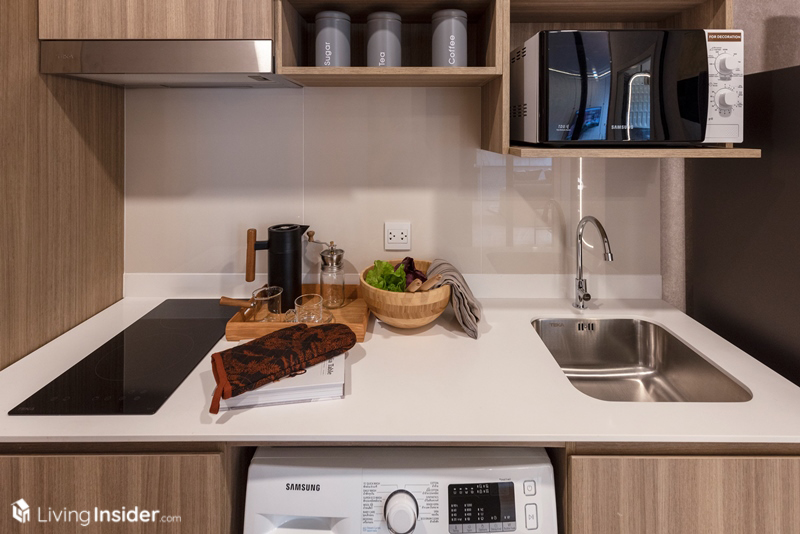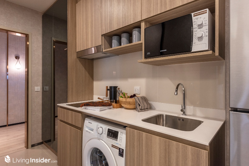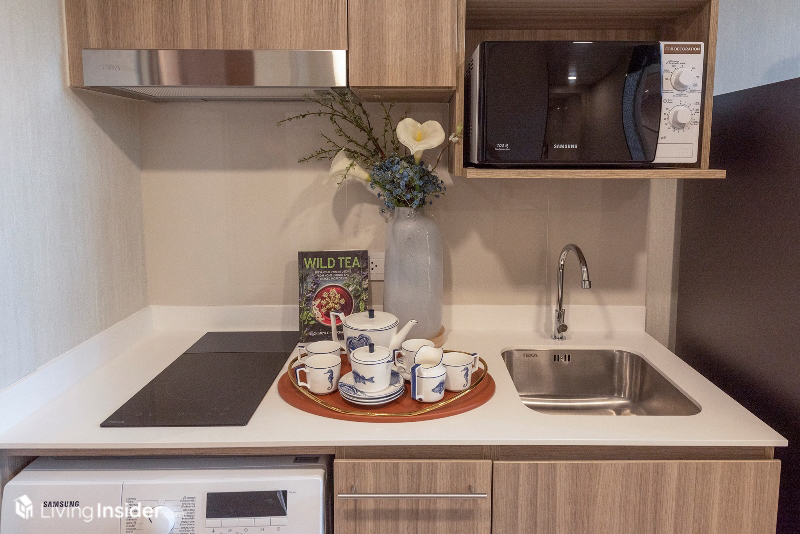 จุดแรกที่จะพบในห้องนี้คือ ห้องครัว ได้แบบครัวเปิด ซึ่งบิวท์อินเคาน์เตอร์ครัว พร้อมตู้เก็บของด้านบนมาให้แบบเข้าเซต โดยด้านล่างเคาน์เตอร์จะเว้นพื้นที่ไว้สำหรับวางเครื่องซักผ้าฝาหน้า