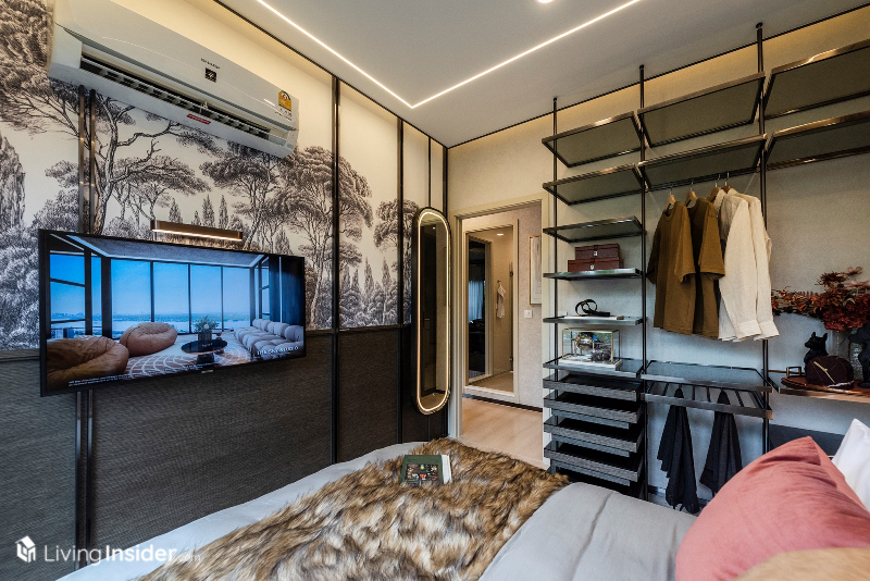 กลับเข้ามาด้านในเพื่อไปดูจุดอื่นกันต่อ โดยห้องนี้อยู่ติดกับห้องนั่งเล่นซึ่งทางโครงการทำเป็นห้องนอนให้ดูเป็นตัวอย่าง สามารถวางเตียง 5 ฟุต และตู้เสื้อผ้าได้ แต่ใครจะปรับเปลี่ยนเป็นห้องทำงานก็สามารถทำได้ ถือว่าเหมาะกับคนที่เน้นทำงานที่บ้าน Work From Home อยู่เหมือนกัน
