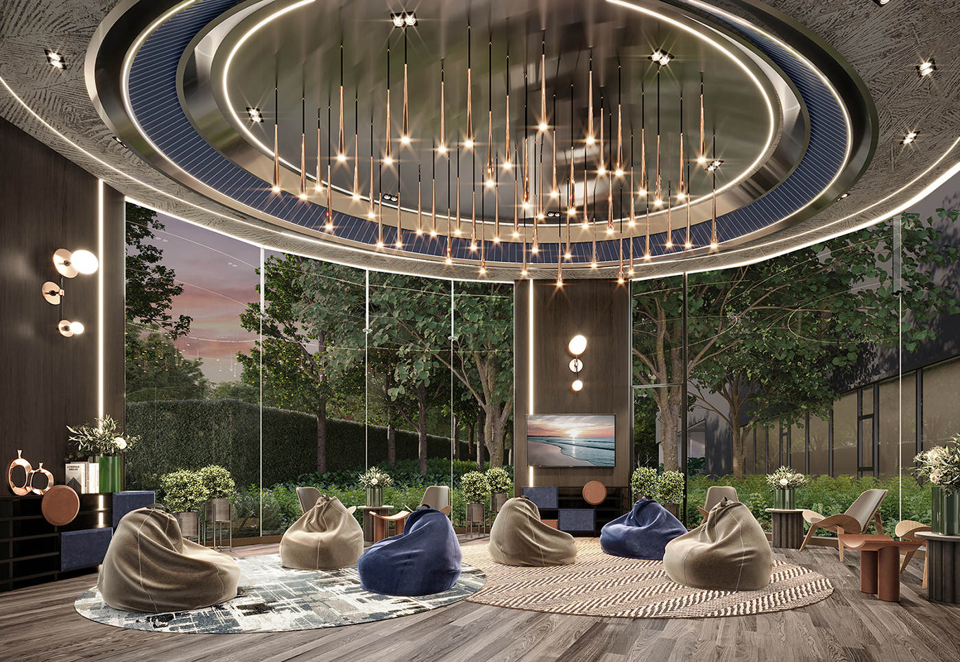 แต่ที่ชอบคือการดีไซน์พื้นที่รับรองแบบใหม่โดยนำ Lobby มาผสมผสานกับ Co-Working Space ได้อย่างลงตัว โดยมีมาให้ถึง 4 จุด เพื่อให้ลูกบ้านแต่ละคนมีสเปซในการใช้งานเพิ่มขึ้น อีกโซนหนึ่งคือ Playfulness Bar ที่มีทั้งมุมนั่งชิลแบบโซฟา มุมนั่งเล่นนั่งคุย หรือถ้าอยากนั่งทำงานแบบจริงจังก็มีโต๊ะไว้รอบรังอยู่อีกมุมหนึ่งของห้อง