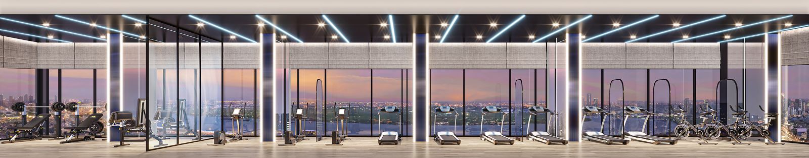 อีกฟากหนึ่งในส่วนของ The Muscle Factory Panoramic Fitness เตรียมเครื่องออกกำลังกายไว้ให้หลากหลาย โดยผนังฝั่งหนึ่งถูกแทนที่ด้วยกระจก ทำให้มองเห็นวิวแม่น้ำได้เช่นเดียวกับฝั่งสระว่ายน้ำ