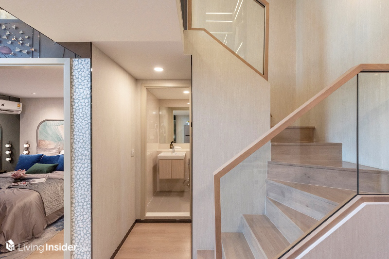สำหรับชั้นบนนั้นจะเป็น ห้องนอน ซึ่งมีความพิเศษตรงที่มีประตูปิดกั้นอย่างจริงจัง แยกพื้นที่ชั้นล่างและชั้นบนชัดเจน โดยฝั่งหนึ่งคือมุมพักผ่อนสามารถวางเตียง 5 ฟุต โต๊ะข้างหัวเตียง ก็ยังมีสเปซว่างให้วางโซฟาไว้นั่งเล่นก่อนเข้านอน