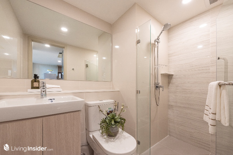 ฝั่งตรงข้ามเป็น ห้องน้ำ ที่ยังคงเข้าออกได้ 2 ทางเช่นเดิม คือทางห้องนั่งเล่นและทาง Master Bedroom เตรียมสุขภัณฑ์มาให้ครบพร้อมใช้งาน