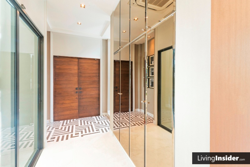 ประตูหน้าบ้านออกแบบและทำจากไม้อย่างดี เมื่อเข้าสู่ตัวบ้าน จะเจอ Foyer (โถงทางเข้าบ้าน) ที่พื้นปูด้วยหินแท้นำเข้าจากอิตาลีซึ่งเป็นลวดลายที่สั่งทำพิเศษเฉพาะโครงการนี้เท่านั้น โดยถ้าสังเกตจะเห็นว่าด้านซ้ายมือจะมีประตูกระจกสไลด์ซึ่งประตูนี้จะใช้เวลาเข้าจากบริเวณลานจอดรถหน้าบ้านได้อีกทางด้วยครับ