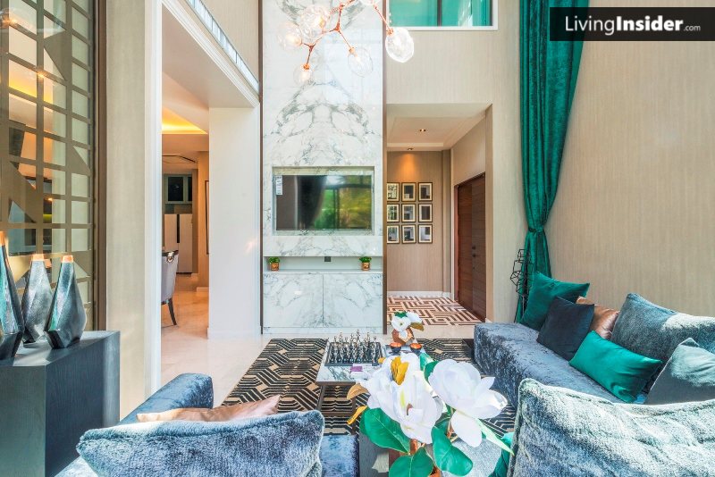 โถงห้องรับแขก แนวคิด "vertical living" เพดานสูงถึง 7 เมตร นอกจากนี้ผนังยังใช้กระจกหน้าต่างบานสูงติดตั้งให้ด้วย ซึ่งจะช่วยให้บ้านดูโปร่งและสว่าง โดยจะสามารถเห็นวิวรอบๆบ้านได้หมด โดยที่ชั้น 1 ของบ้านจะปูด้วยกระเบื้องหินที่นำเข้าจากอิตาลีทั้งหมด