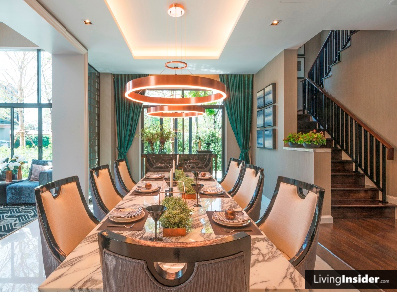 โดยโถงส่วนรับรองแขกจะเชื่อมต่อกับพื้นที่รับประทานอาหาร ซึ่งสามารถวางโต๊ะอาหารชุดใหญ่นั่งได้ถึง 8 คนเลยครับ