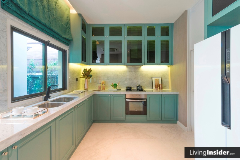 พื้นที่ของบริเวณทานอาหารจะเชื่อมต่อกับส่วนครัวของบ้านซึ่งเป็น Double Kitchen โดยส่วนภายในบ้านจะเป็นส่วนของครัวฝรั่งและถ้าเปิดประตูออกไปหลังบ้านจะมีพื้นที่ทำครัวไทยได้ด้วย