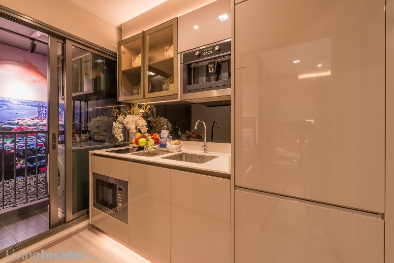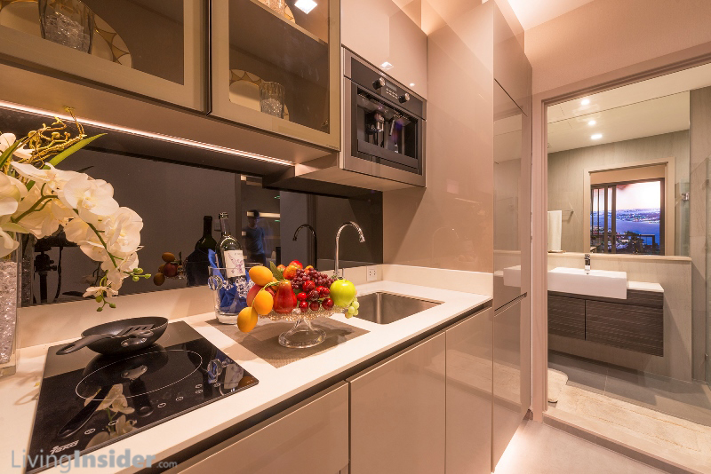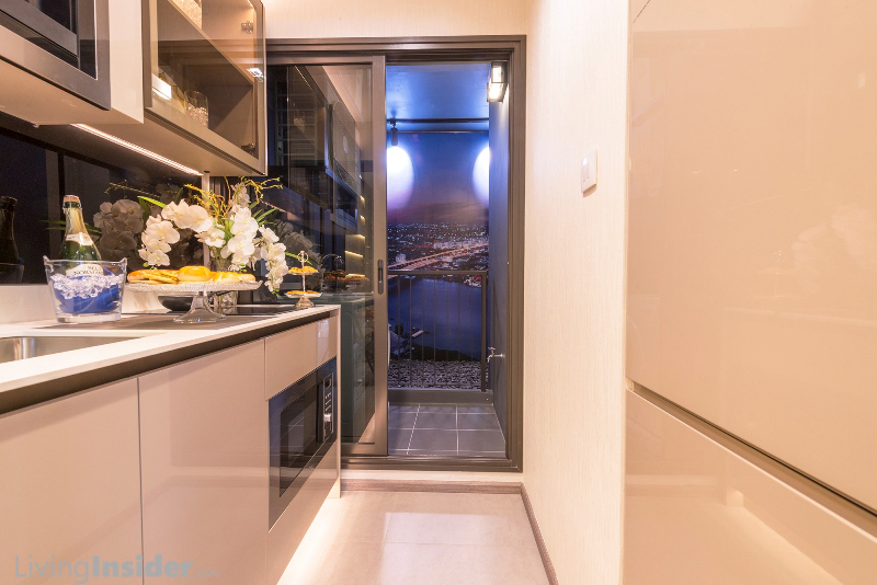 เปิดห้องมาพบกับส่วนครัว Counter Top หินสังเคราะห์ สำหรับรับประทานอาหาร พร้อม เตาไฟฟ้า, เครื่องดูดควันของTeka ชั้นเก็บของบิ้วท์อิน ประตูบานพับผิวกลอสเงา