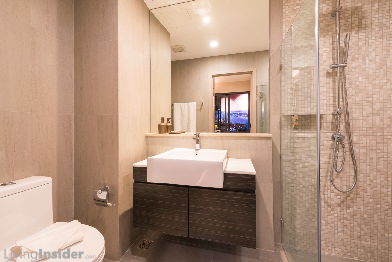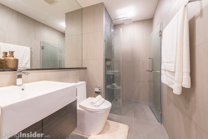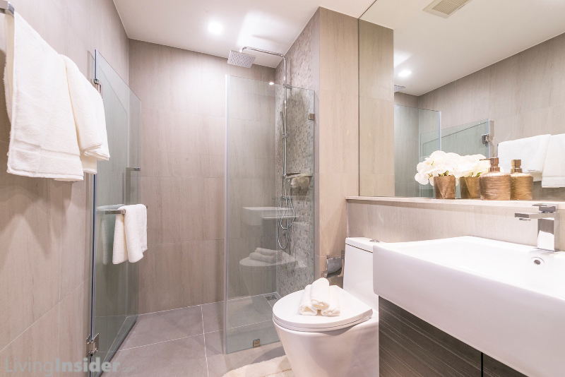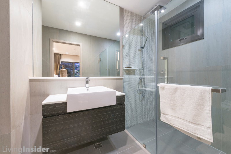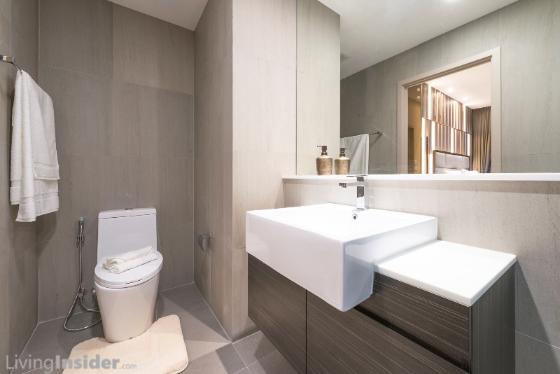 ห้องน้ำทั้ง 2 ห้อง (Living, Master Bedroom) แบ่งส่วนเปียก - แห้ง สุขภัณฑ์ยี่ห้อ Cristina เช่นเดียวกับห้อง Type อื่นๆ เฉพาะห้องน้ำใหญ่มีหน้าต่างด้วย, Top เค้าน์เตอร์อ่างล้างหน้า ปูหินสังเคราะห์ / ผนังส่วนเปียก Mosaic / ธรณีประตู - ชั้นวางสบู่หินอ่อน เช่นเดียวกับห้อง Type 29-30 ตรม.