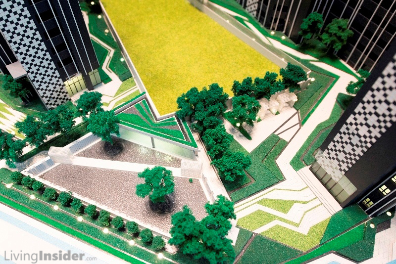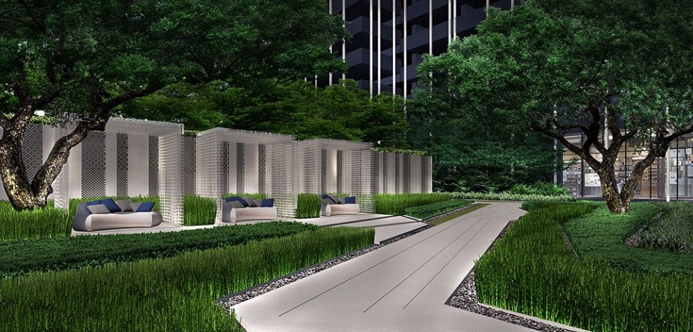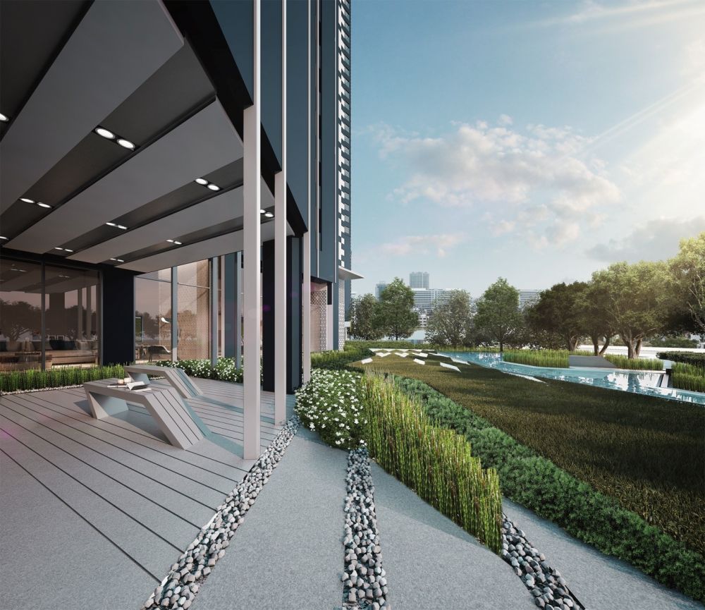 Green space พื้นที่สีเขียวขนาดใหญ่ภายในโครงการ ที่ยังเป็นเสมือน outdoor co-working space-ออกแบบให้มีพื้นที่ที่เป็นน้ำ อยู่รอบๆโครงการ เพื่อความสวยงามและช่วยลดอุณหภูมิอากาศได้อีกด้วย