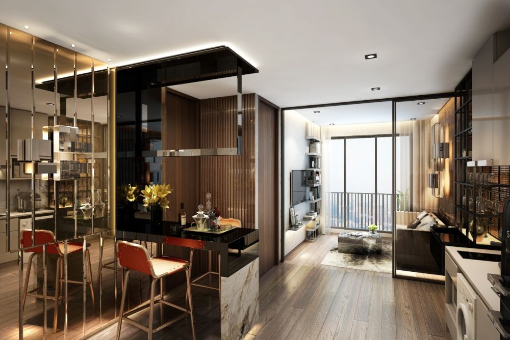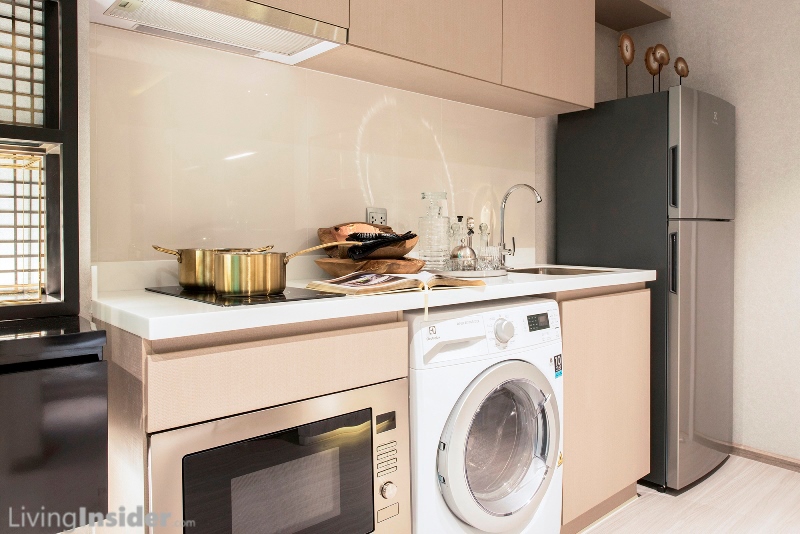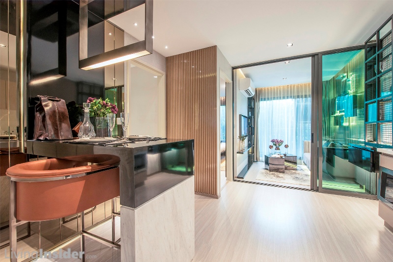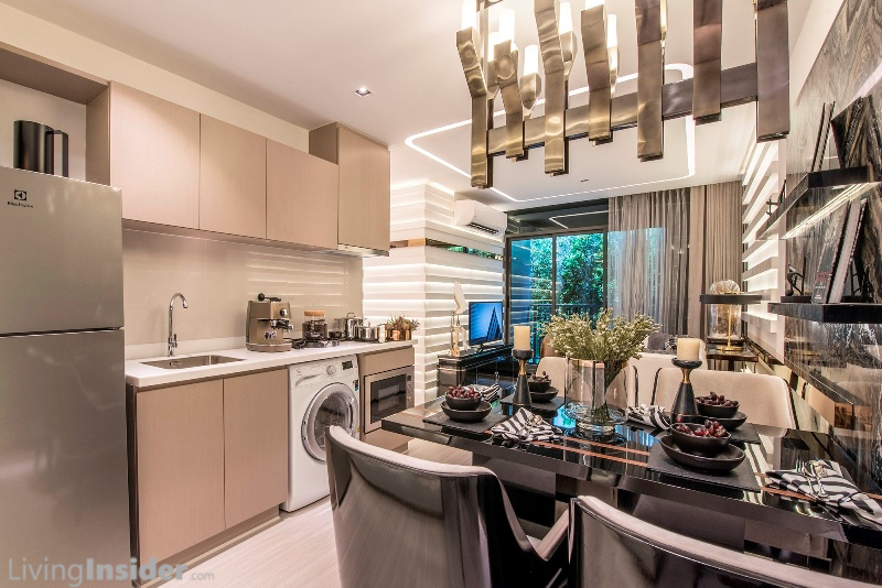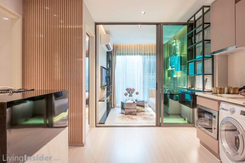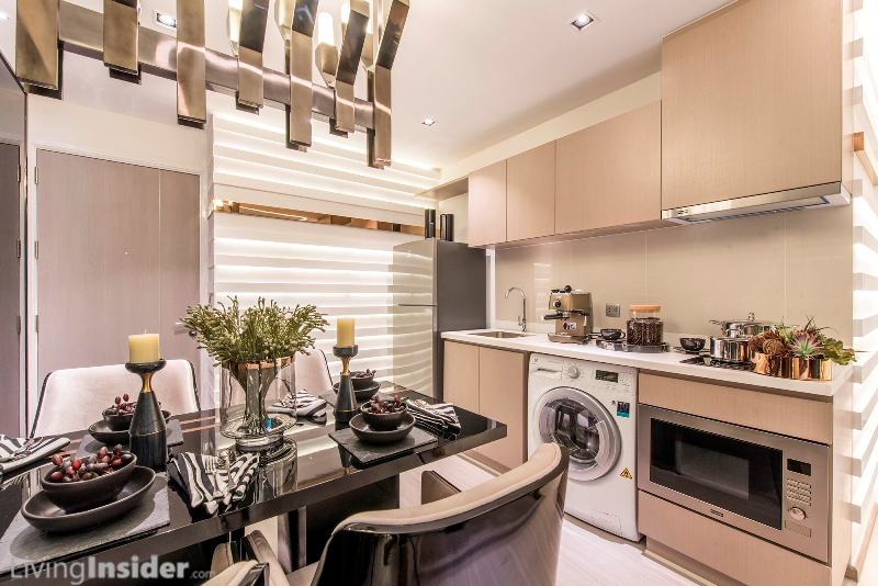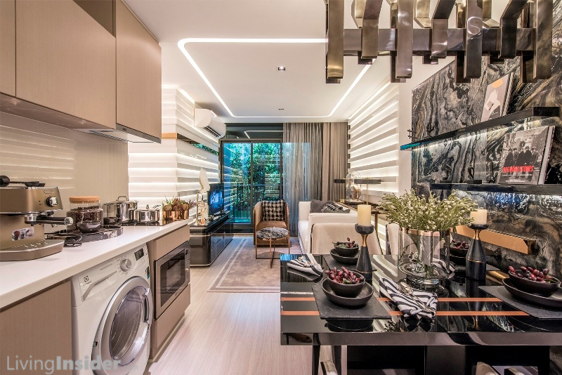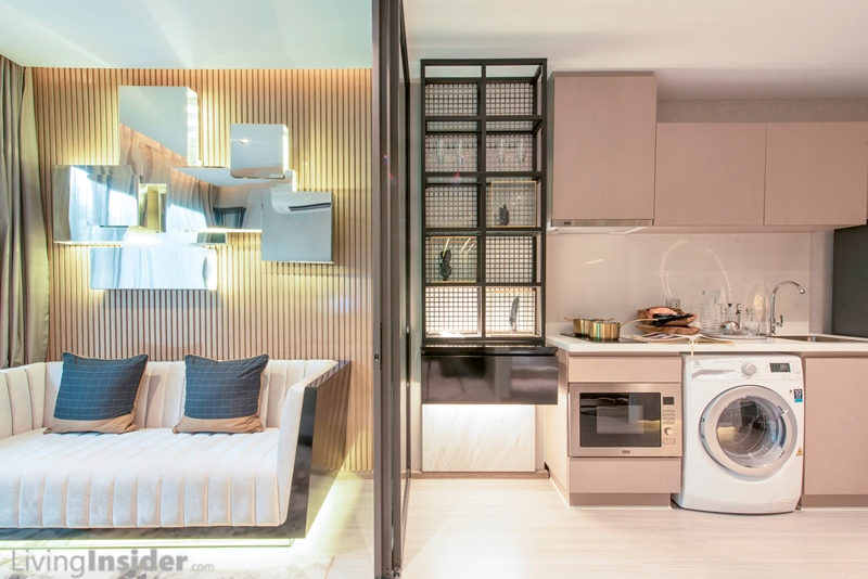 มาดูห้องตัวอย่างของจริงกันบ้างครับ เมื่อเข้ามาภายในห้องจะพบว่าพื้นที่ส่วนหน้าห้องเกือบทั้งหมดจะเป็นส่วนของครัวและเหมือนเค้าเตอร์ที่ออกแบบเป็นโต๊ะทานข้าวด้วย โดยส่วนของห้องนั่งเล่นจริงๆของห้องนี้ จะถูกดันเข้าไปอยู่ในห้องเอนกประสงค์นะครับ