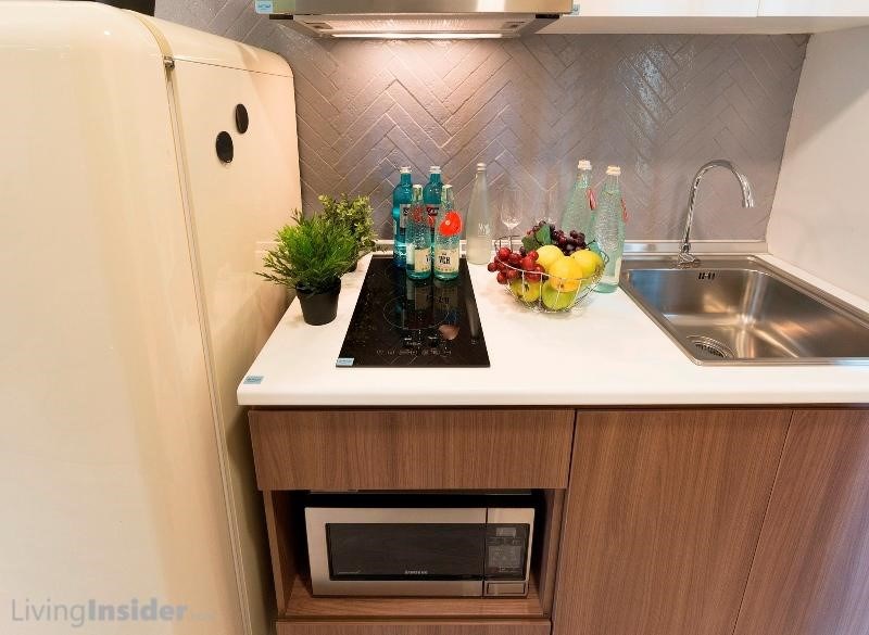 เปิดประตูเข้ามาพบส่วนครัว โครงการทำ Built-in ให้ทุกอย่างทั้งเตาไฟฟ้า / เครื่องดูดควัน / ซิงค์ล้างจาน Top ครัวผิวลามิเนตสีขาว เช่นเดียวกับตู้เก็บของชั้นบน ด้านล่างหน้าบานชั้นเก็บของลายไม้ เว้นที่สำหรับวางไมโครเวฟ และพื้นที่วางตู้เย็น