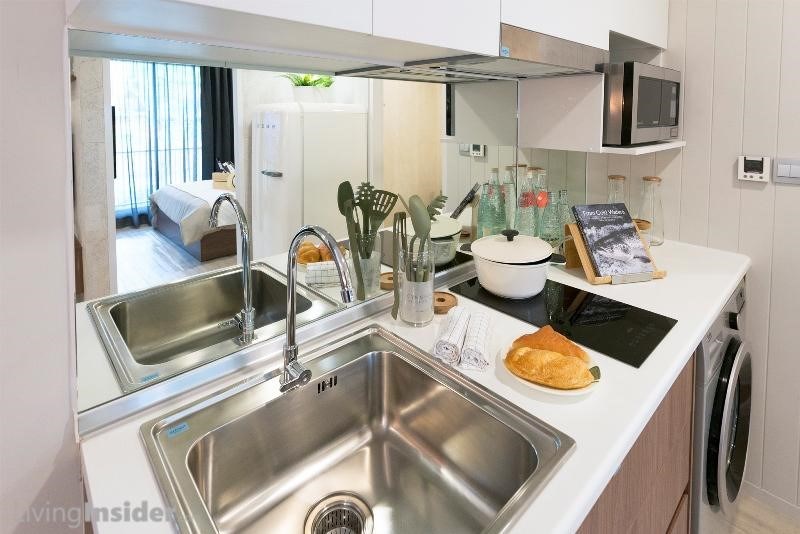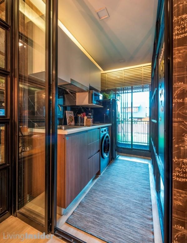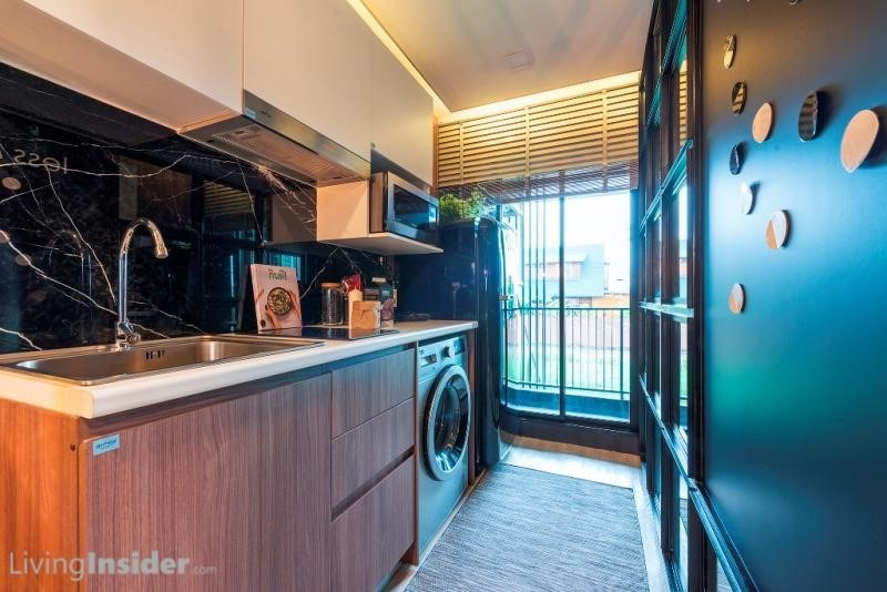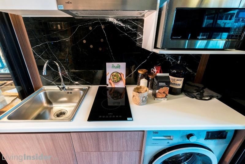 พื้นที่ครัวเป็นแบบปิด กั้นด้วยประตูบานเลื่อน 3 ตอน เซ็ทครัว Built-in อุปกรณ์ต่างๆ เหมือนยูนิต 1-Bedroom ทุกประการ เชื่อมกับส่วนระเบียง สามารถซักล้างได้อย่างไม่มีปัญหา