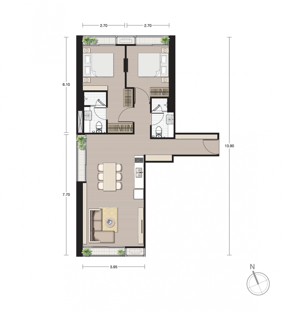 สำหรับ 2 ห้องนอน ก็มีไฮไลท์เหมือนกัน คือ แบบ B5 ห้องนี้เป็นแบบเดียวกับที่โนเบิลทำห้องตัวอย่างของ 2 ห้องนอนไว้ และได้รับความสนใจมากพอสมควร ด้วยการจัด layout มีทางเดินก่อนถึงตัวห้อง ซึ่ง layout แบบนี้ไม่ค่อยพบได้มากนัก สามารถ ทำที่เก็บของหรือตู้วางรองเท้าก่อนถึงตัวห้องได้ นอกจากใช้ประโยชน์ได้แล้ว ยังสามารถตกแต่งสร้างบรรยากาศก่อนเดินเข้าห้อง ทำให้ความรู้สึกของการอยู่คอนโดเหมือนอยู่บ้าน ซึ่งแตกต่างจากคอนโดอื่นๆที่เปิดมาแล้วเจอห้องรับแขกเลย จุดเด่นของห้องนี้อีกอย่าง คือ เป็นห้องที่ได้ระเบียงถึง 3 ด้าน และเป็น city view ที่สวยและดีที่สุดเนื่องจากห้อง Type นี้จะอยู่ที่ชั้นสูง หรือเป็นวิวทางทิศเหนือที่โล่งๆ ไม่มีตึกบัง