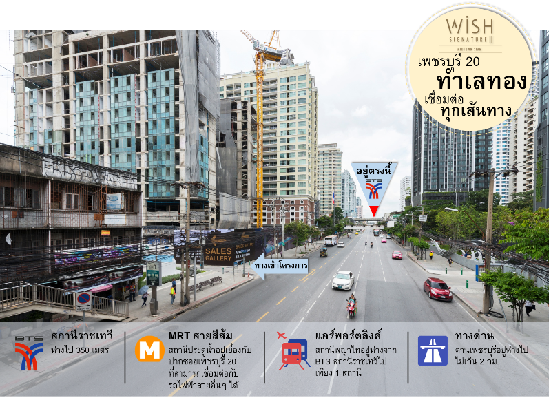 สำหรับการเดินทางไป Sales Gallery ก็ไม่ยากเลย ใครถนัดขับรถก็สามารถขึ้นทางด่วนไปลงด่านเพชรบุรีแล้ววิ่งตรงขึ้นไปทางห้างแพลตตินั่มแค่ 1.7 กม. หรือจะนั่งรถไฟฟ้า BTS ไปลงสถานีราชเทวีแล้วต่อรถแท็กซี่หรือเดินไปอีกแค่ 350 เมตรก็จะถึงปากซอยเพชรบุรี 20