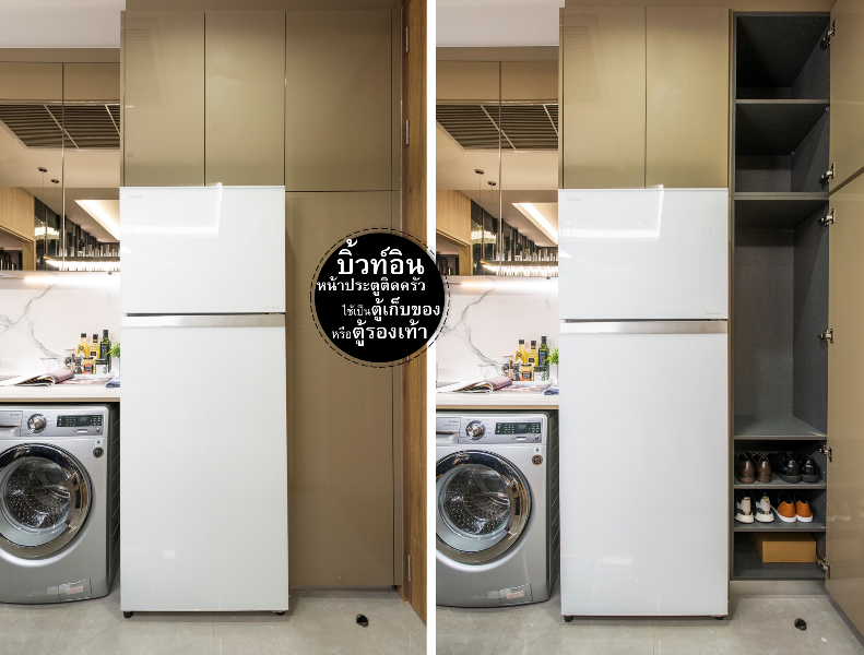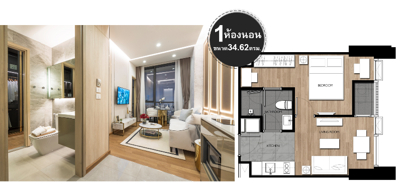 เมื่อเปิดประตูเข้ามา ขวามือจะเป็นส่วนพื้นที่ครัว ซ้ายมือเป็นห้องน้ำ ซึ่งโครงการจะมีบิวท์อินส่วนครัวและสุขภัณฑ์ในห้องน้ำแถมให้มาด้วย แต่อย่าเรียกว่าของแถมเลย เพราะราคาและคุณภาพดีเกินกว่าจะเป็นของแถม