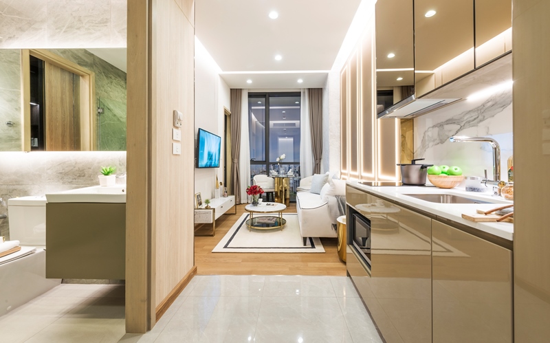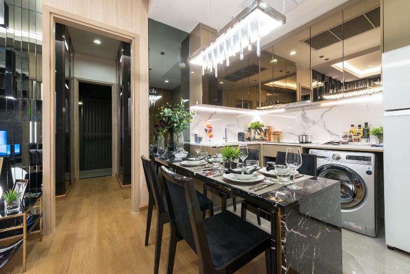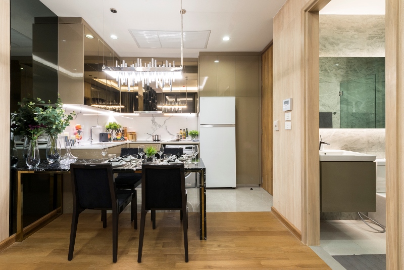 มาเริ่มกันที่โซนห้องครัวที่โครงจะแถมตู้บิ้วท์อิน เตาไฟฟ้า อ่างล้างจาน ให้ทุกยูนิต ซึ่งเป็นตู้บิ้วท์อินเข้ามุมขนาดใหญ่เตาไฟฟ้าดิจิตอลแบบ 4 หัว อ่างล้างจานและท๊อปเคาน์เตอร์และผนังที่ทำมาจากหินควอทซ์ ถ้าใครชอบห้องโล่งๆ อาจเลือกใช้โต๊ะอาหารที่ออกแบบให้พับซ่อนเก็บไว้ก็ได้ แต่จากที่ดูด้วยสายตา พื้นที่ขนาดนี้กว้างมากพอที่จะวางโต๊ะอาหาแบบนั่ง 4 คน ได้สบายๆ