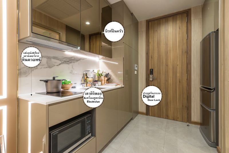 ด้วยวัสดุชั้นดีที่เลือกมาทั้งตู้บิ้วท์อินที่มีชั้นเก็บของไว้เก็บของใช้เครื่องครัวมากมาย ชั้นสำหรับวางเตาอบหรือไมโครเวฟ ที่วางตู้เย็นขนาดใหญ่ มาพร้อมกับเตาไฟฟ้าดิจิตอล Electrolux 2 หัว และอ่างล้างจานวัสดุเกรดพรีเมี่ยม ที่สำคัญอ่างลึกมากช่วยป้องกันน้ำกระเด็นเลอะเทอะได้ดีทีเดียวล่ะ