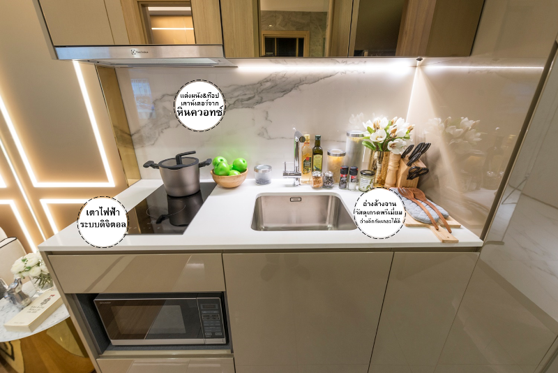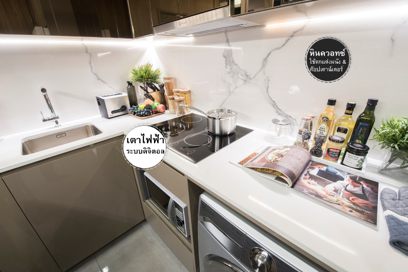 อีกจุดที่ชอบมากๆ สำหรับแม่ครัวมือสมัครเล่นอย่างเราๆ ก็คือท๊อปเคาน์เตอร์และผนังที่ทำมาจากหินควอทซ์ วัสดุคุณภาพสูง สวยและทันสมัย ป้องกันรอยขีดข่วนได้ดี ที่สำคัญ เวลาน้ำมันหรืออาหารกระเด็นเลอะเทอะก็เช็ดออกง่ายดาย ช่วยให้ครัวดูสวยใหม่อยู่เสมอ