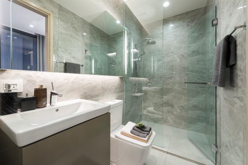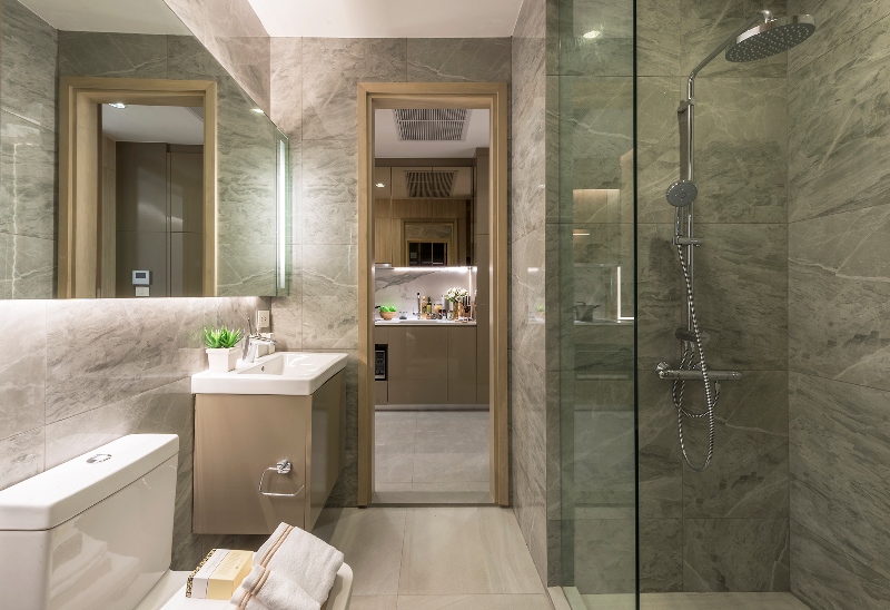 ส่วนห้องน้ำก็มีทางเข้าออก 2 ประตู คือจะเข้าจากด้านนอกฝั่งห้องนั่งเล่นก็ได้ หรือจะใช้เป็นห้องน้ำส่วนตัวเปิดกลับเข้าห้องนอนได้โดยไม่ต้องเดินผ่านห้องนั่งเล่นก็ได้ สุขภัณฑ์ทั้งหมดเลือกใช้แบรนด์พรีเมียมจากเยอรมนีที่เหมาะกับการใช้งานหนักได้จริงจริง ทั้งชักโครกขนาดใหญ่ คนตัวใหญ่ไซส์ XL นั่งได้สบายๆ อ่างล้างหน้าแบบลอยตัวช่วยให้ทำความสะอาดได้ง่าย พร้อมบิ้วท์อินตู้หลังกระจกสำหรับเก็บอุปกรณ์ต่างๆ