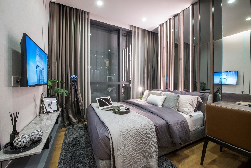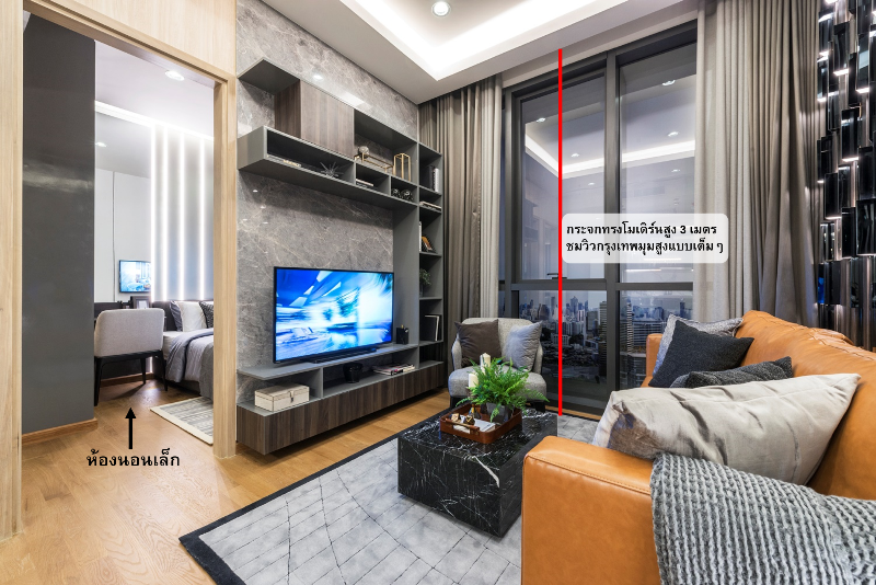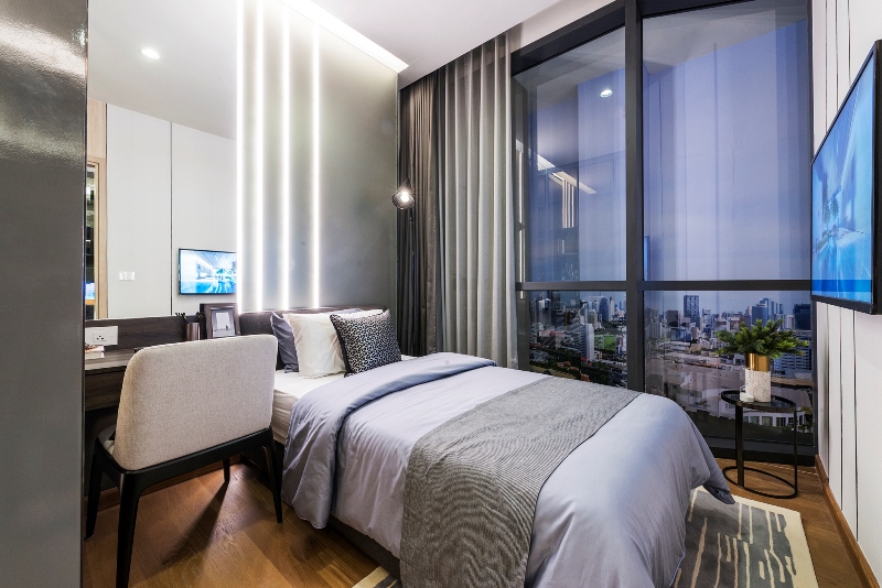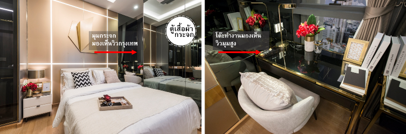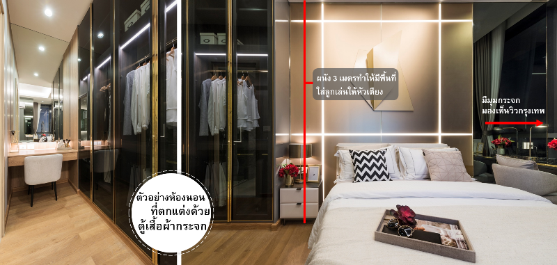 นอกจากตู้เสื้อผ้าขนาดใหญ่แล้วภายในห้องนอนใหญ่ยังสามารถวางเตียงใหญ่และโต๊ะทำงานขนนาดย่อมได้อีก 1 ตัว และมีพื้นที่อีกเล็กน้อยเพื่อจัดวางของตกแต่งและทำตู้บิ้วท์อิน... และอีกจุดที่ชอบมากๆ ก็คือหน้าต่างบานสูงที่มองเห็นวิวกรุงเทพในยามค่ำคืนได้นี่แหละ ไม่ว่าคุณจะนอนห้องไหนมุมไหนก็ฟิน