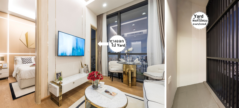 ห้องนั่งเล่นที่มีพื้นที่กว้างขวางจะจัดเป็นมุมบันเทิงดูหนังฟังเพลงโดยเฉพาะหรือจะเพิ่มมุมทำงานเข้าไปอีกก็ยังพอมีพื้นที่เหลือเฟือ และแม้ว่าคอนโดนี้จะไม่มีระเบียงแต่ก็ได้เพิ่ม Yard หรือพื้นที่ใช้สอยอเนกประสงค์เข้าไปสำหรับใช้ซักล้างเล็กๆ น้อยๆ วางคอมแอร์ หรือตากผ้าในร่ม
