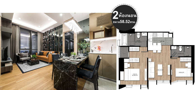เขยิบราคาขึ้นมาอีกกับห้องขนาด 2 ห้องนอน ที่มีฟังก์ชั่นคล้ายกับแบบแรกแต่เพิ่มประโยชน์ใช้สอยและมีความเป็นส่วนตัวมากกว่าเดิมเป็นเท่าตัว กับ 2 ห้องนอน 2 ห้องน้ำ ห้องครัวและห้องนั่งเล่นกว้างขวางขึ้น ที่สำคัญห้องนอนทั้ง 2 ห้องมีความเป็นส่วนตัวมากขึ้นโดยใช้ห้องนั่งเล่นคั่นกลาง