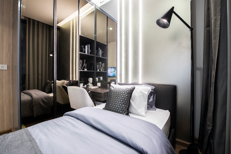 มาต่อกันที่ห้องนอน... ที่ออกแบบผังห้องมาให้เราสามารถเพิ่มพื้นที่ใช้สอยได้อย่างคุ้มค่าทั้งมุมแต่งตัว ตู้เสื้อผ้า และเตียง โดยเฉพาะสาวๆ ที่มีเสื้อผ้าและของใช้จุกจิกเยอะแยะ แนะนำเลยว่าให้ทำตู้เสื้อผ้าบิวท์อินสูงจากพื้นจรดเพดาน เพื่อเพิ่มช่องเก็บของซ่อนไว้ในตู้ทั้งหมดพียงเท่านี้ห้องก็ไม่รกแล้ว ซึ่งห้องตัวอย่างที่โครงการออกแบบมาก็เป็นอีกหนึ่งตัวอย่างที่ขอแนะนำ เพราะกระจกช่วยทำให้ห้องดูกว้างและโมเดิร์นมากๆ